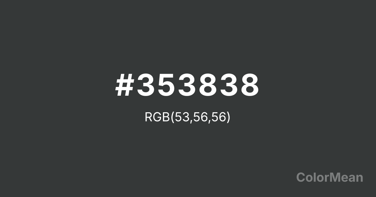 #353838 RGB value is (53, 56, 56). The hex color red value is 53, green is 56, and blue is 56. Its HSL format shows a hue of 180°, saturation of 3 percent, and lightness of 21 percent. The CMYK process values are 5 percent, 0 percent, 0 percent, 78 percent.