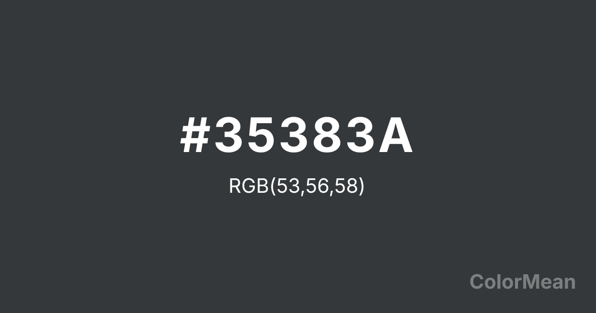 #35383A RGB value is (53, 56, 58). The hex color red value is 53, green is 56, and blue is 58. Its HSL format shows a hue of 204°, saturation of 5 percent, and lightness of 22 percent. The CMYK process values are 9 percent, 3 percent, 0 percent, 77 percent.