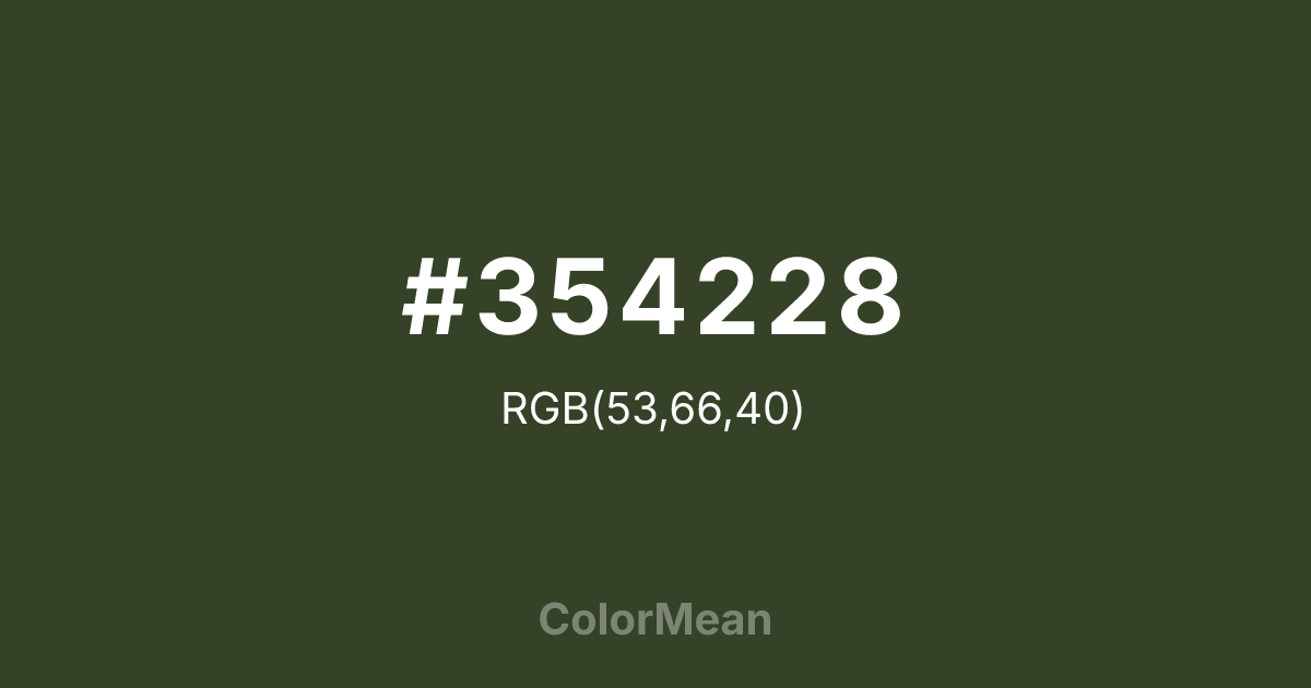 #354228 RGB value is (53, 66, 40). The hex color red value is 53, green is 66, and blue is 40. Its HSL format shows a hue of 90°, saturation of 25 percent, and lightness of 21 percent. The CMYK process values are 20 percent, 0 percent, 39 percent, 74 percent.
