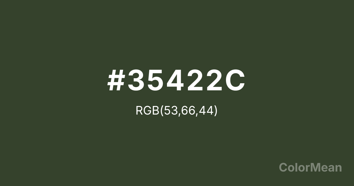 #35422C RGB value is (53, 66, 44). The hex color red value is 53, green is 66, and blue is 44. Its HSL format shows a hue of 95°, saturation of 20 percent, and lightness of 22 percent. The CMYK process values are 20 percent, 0 percent, 33 percent, 74 percent.