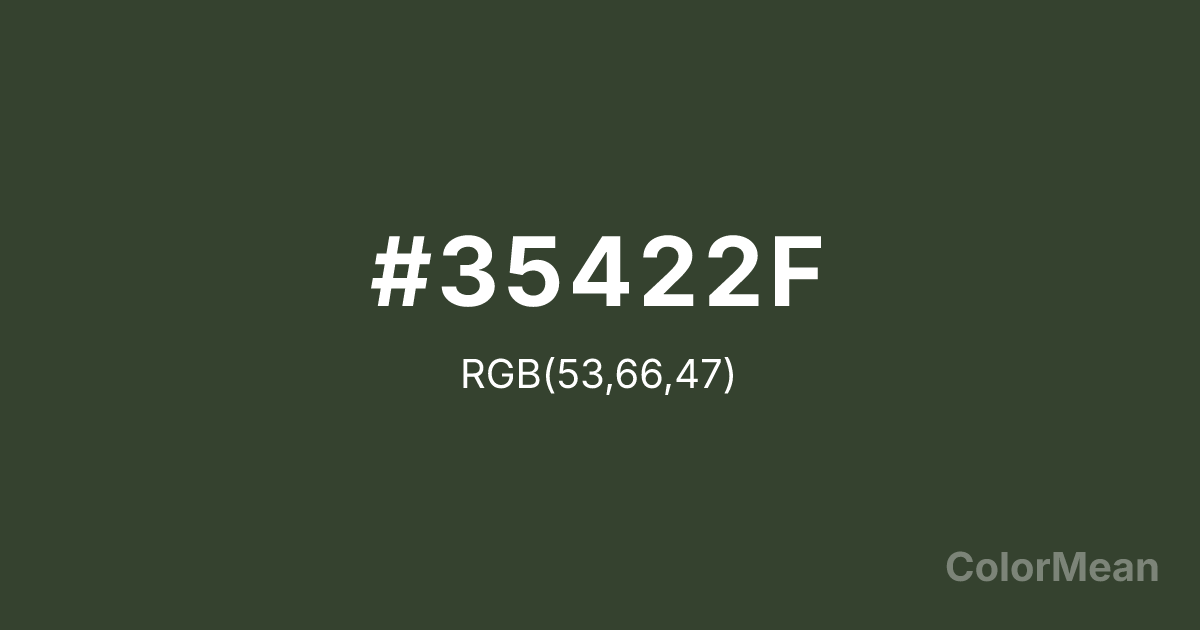 #35422F RGB value is (53, 66, 47). The hex color red value is 53, green is 66, and blue is 47. Its HSL format shows a hue of 101°, saturation of 17 percent, and lightness of 22 percent. The CMYK process values are 20 percent, 0 percent, 29 percent, 74 percent.