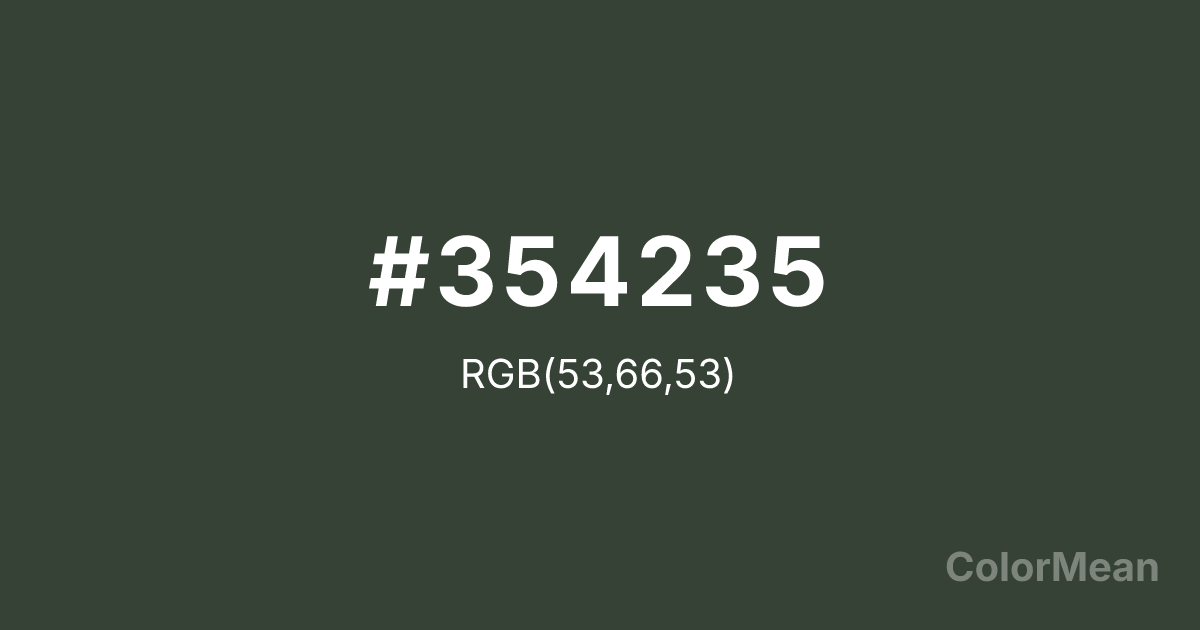 #354235 RGB value is (53, 66, 53). The hex color red value is 53, green is 66, and blue is 53. Its HSL format shows a hue of 120°, saturation of 11 percent, and lightness of 23 percent. The CMYK process values are 20 percent, 0 percent, 20 percent, 74 percent.