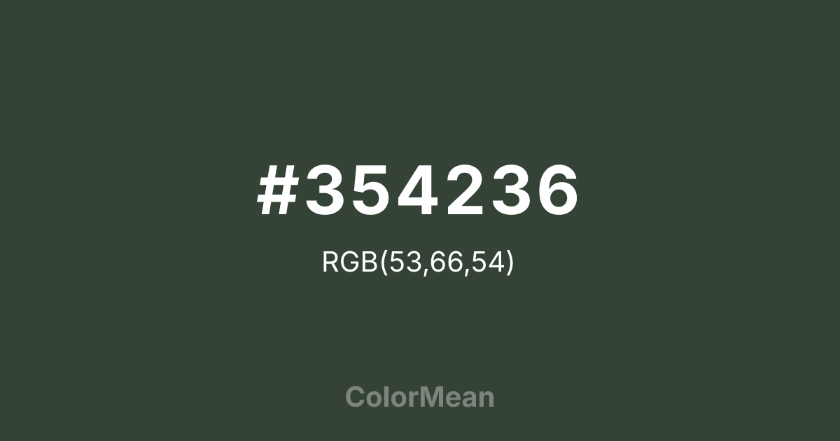 #354236 RGB value is (53, 66, 54). The hex color red value is 53, green is 66, and blue is 54. Its HSL format shows a hue of 125°, saturation of 11 percent, and lightness of 23 percent. The CMYK process values are 20 percent, 0 percent, 18 percent, 74 percent.