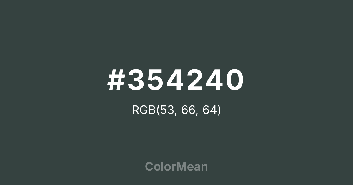 #354240 RGB value is (53, 66, 64). The hex color red value is 53, green is 66, and blue is 64. Its HSL format shows a hue of 171°, saturation of 11 percent, and lightness of 23 percent. The CMYK process values are 20 percent, 0 percent, 3 percent, 74 percent.