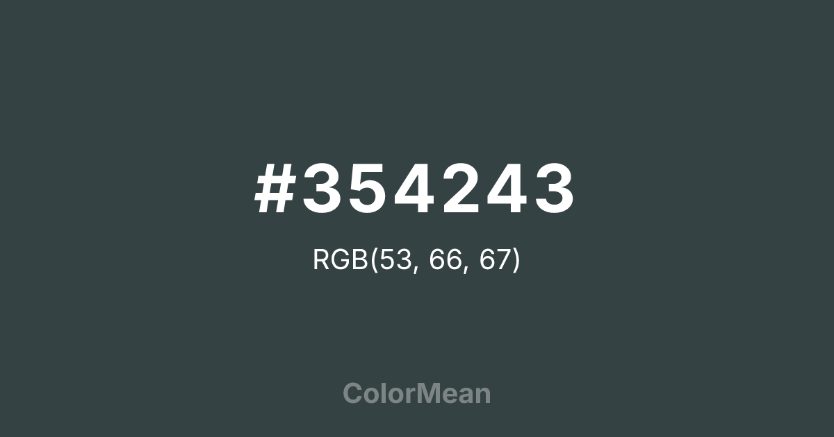 #354243 RGB value is (53, 66, 67). The hex color red value is 53, green is 66, and blue is 67. Its HSL format shows a hue of 184°, saturation of 12 percent, and lightness of 24 percent. The CMYK process values are 21 percent, 1 percent, 0 percent, 74 percent.