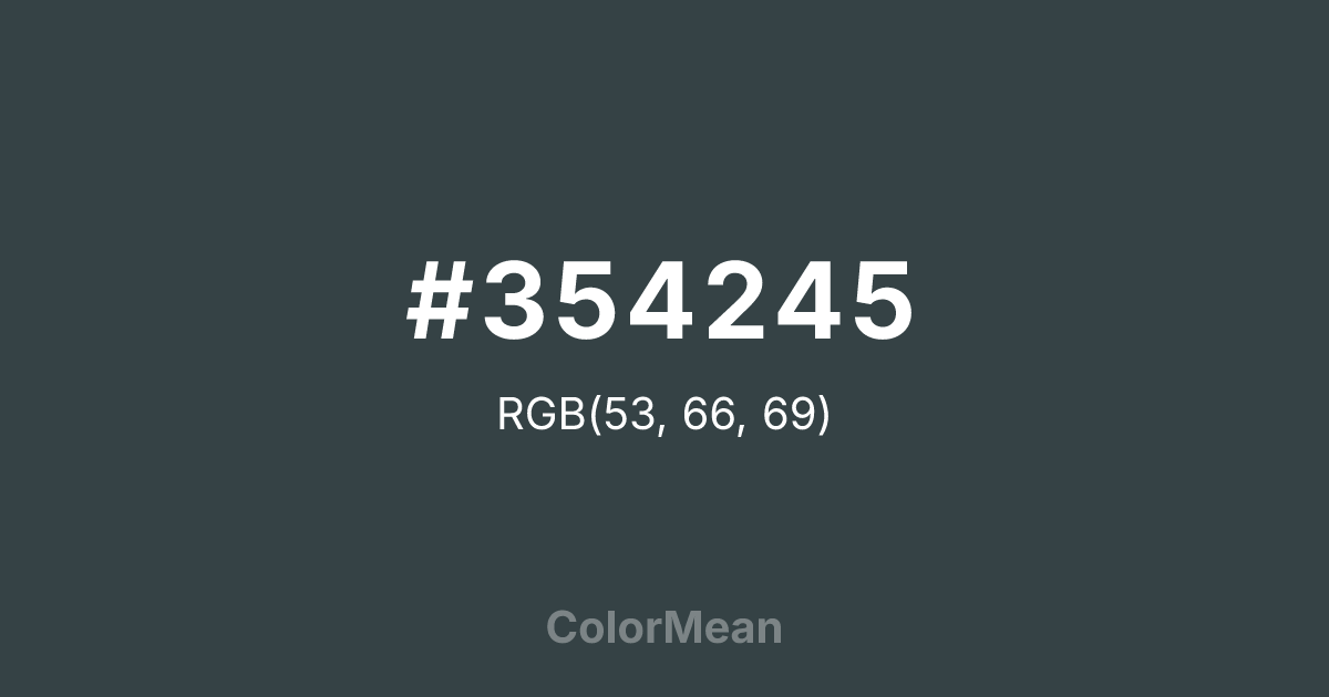 #354245 RGB value is (53, 66, 69). The hex color red value is 53, green is 66, and blue is 69. Its HSL format shows a hue of 191°, saturation of 13 percent, and lightness of 24 percent. The CMYK process values are 23 percent, 4 percent, 0 percent, 73 percent.