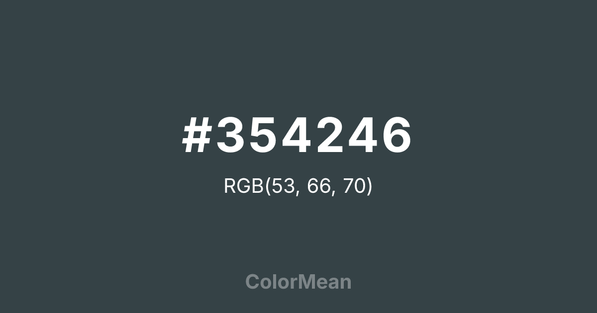 #354246 RGB value is (53, 66, 70). The hex color red value is 53, green is 66, and blue is 70. Its HSL format shows a hue of 194°, saturation of 14 percent, and lightness of 24 percent. The CMYK process values are 24 percent, 6 percent, 0 percent, 73 percent.