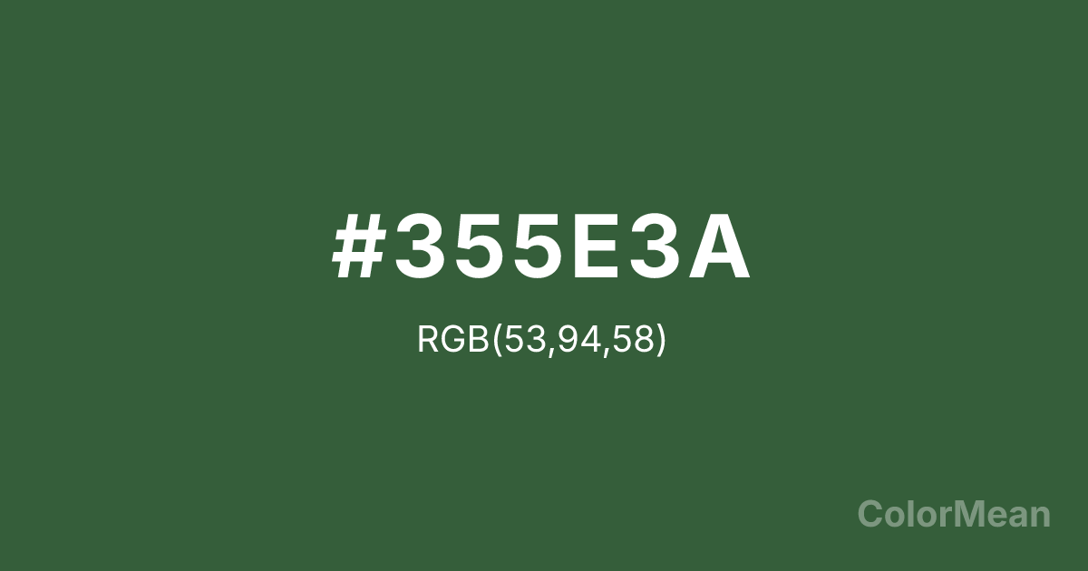 #355E3A RGB value is (53, 94, 58). The hex color red value is 53, green is 94, and blue is 58. Its HSL format shows a hue of 127°, saturation of 28 percent, and lightness of 29 percent. The CMYK process values are 44 percent, 0 percent, 38 percent, 63 percent.