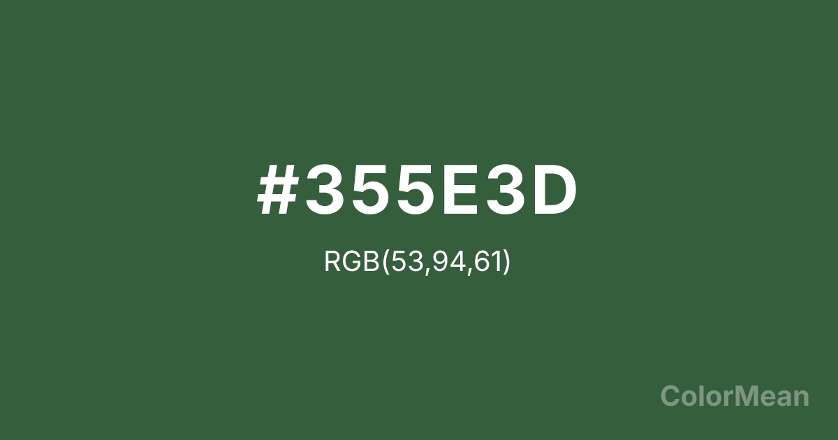 #355E3D RGB value is (53, 94, 61). The hex color red value is 53, green is 94, and blue is 61. Its HSL format shows a hue of 132°, saturation of 28 percent, and lightness of 29 percent. The CMYK process values are 44 percent, 0 percent, 35 percent, 63 percent.