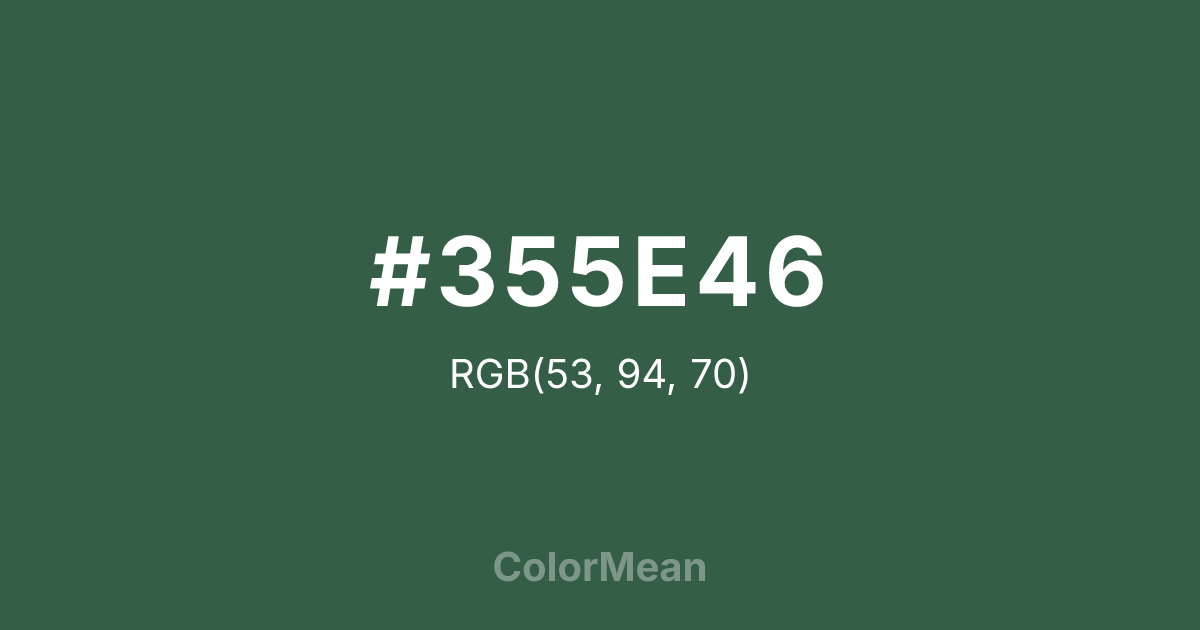 #355E46 RGB value is (53, 94, 70). The hex color red value is 53, green is 94, and blue is 70. Its HSL format shows a hue of 145°, saturation of 28 percent, and lightness of 29 percent. The CMYK process values are 44 percent, 0 percent, 26 percent, 63 percent.