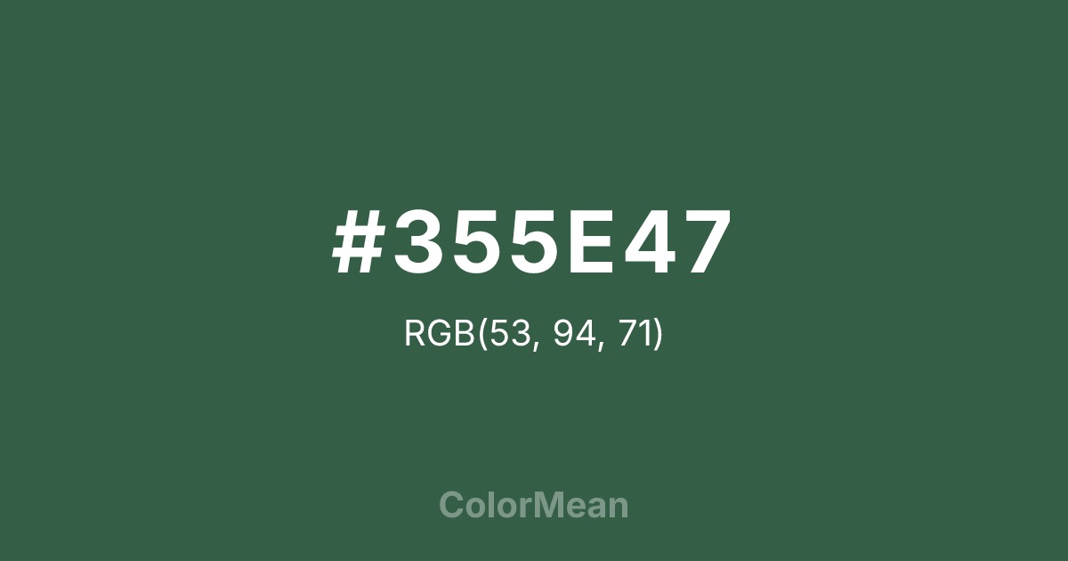 #355E47 RGB value is (53, 94, 71). The hex color red value is 53, green is 94, and blue is 71. Its HSL format shows a hue of 146°, saturation of 28 percent, and lightness of 29 percent. The CMYK process values are 44 percent, 0 percent, 24 percent, 63 percent.