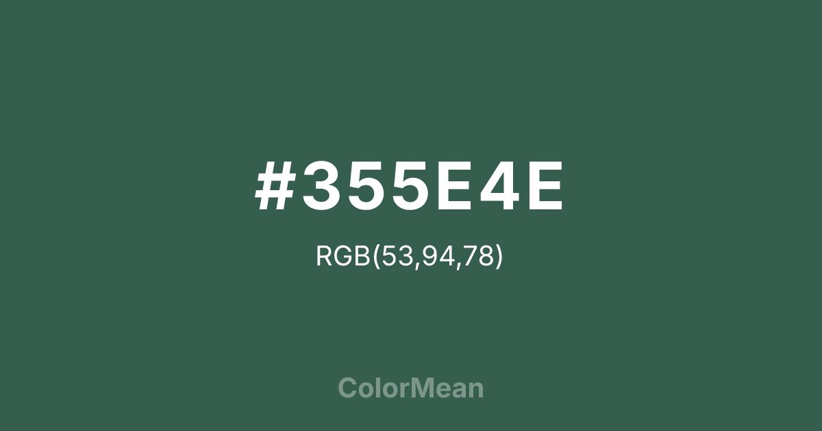 #355E4E RGB value is (53, 94, 78). The hex color red value is 53, green is 94, and blue is 78. Its HSL format shows a hue of 157°, saturation of 28 percent, and lightness of 29 percent. The CMYK process values are 44 percent, 0 percent, 17 percent, 63 percent.