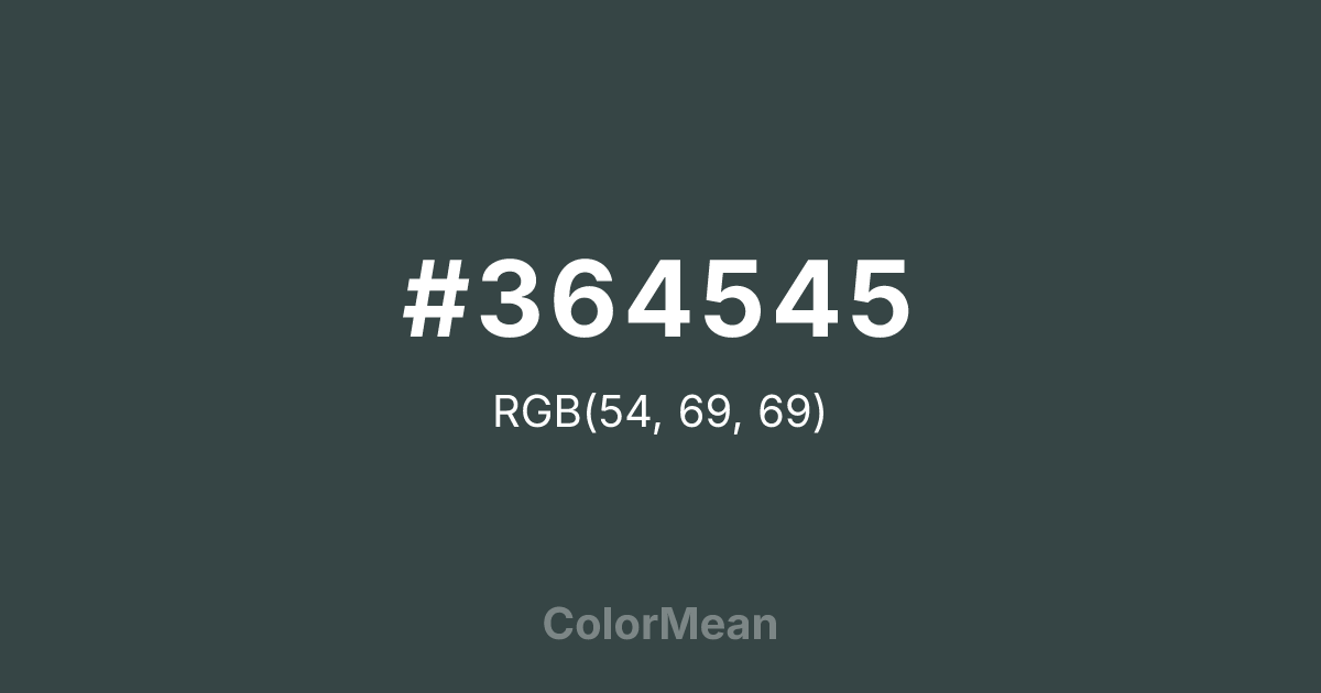 #364545 RGB value is (54, 69, 69). The hex color red value is 54, green is 69, and blue is 69. Its HSL format shows a hue of 180°, saturation of 12 percent, and lightness of 24 percent. The CMYK process values are 22 percent, 0 percent, 0 percent, 73 percent.