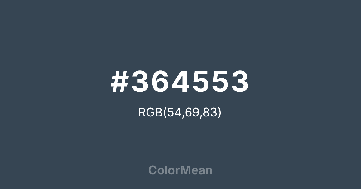#364553 RGB value is (54, 69, 83). The hex color red value is 54, green is 69, and blue is 83. Its HSL format shows a hue of 209°, saturation of 21 percent, and lightness of 27 percent. The CMYK process values are 35 percent, 17 percent, 0 percent, 67 percent.