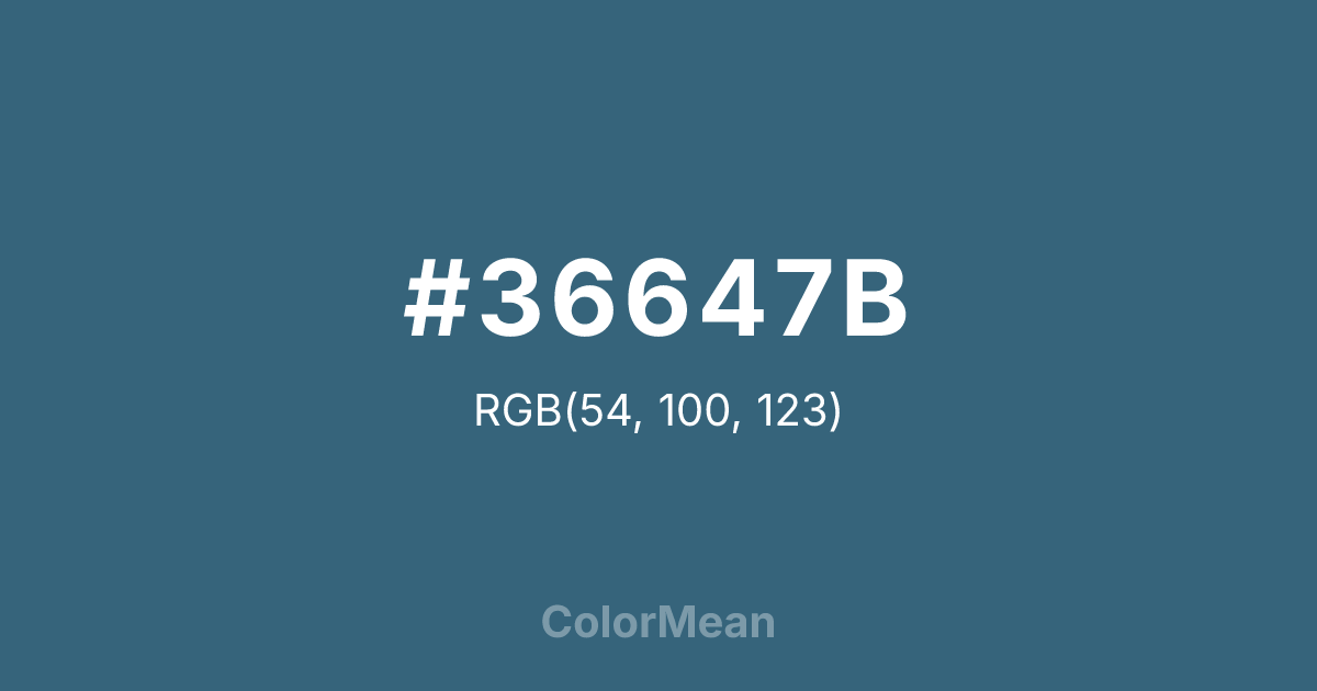 #36647B RGB value is (54, 100, 123). The hex color red value is 54, green is 100, and blue is 123. Its HSL format shows a hue of 200°, saturation of 39 percent, and lightness of 35 percent. The CMYK process values are 56 percent, 19 percent, 0 percent, 52 percent.
