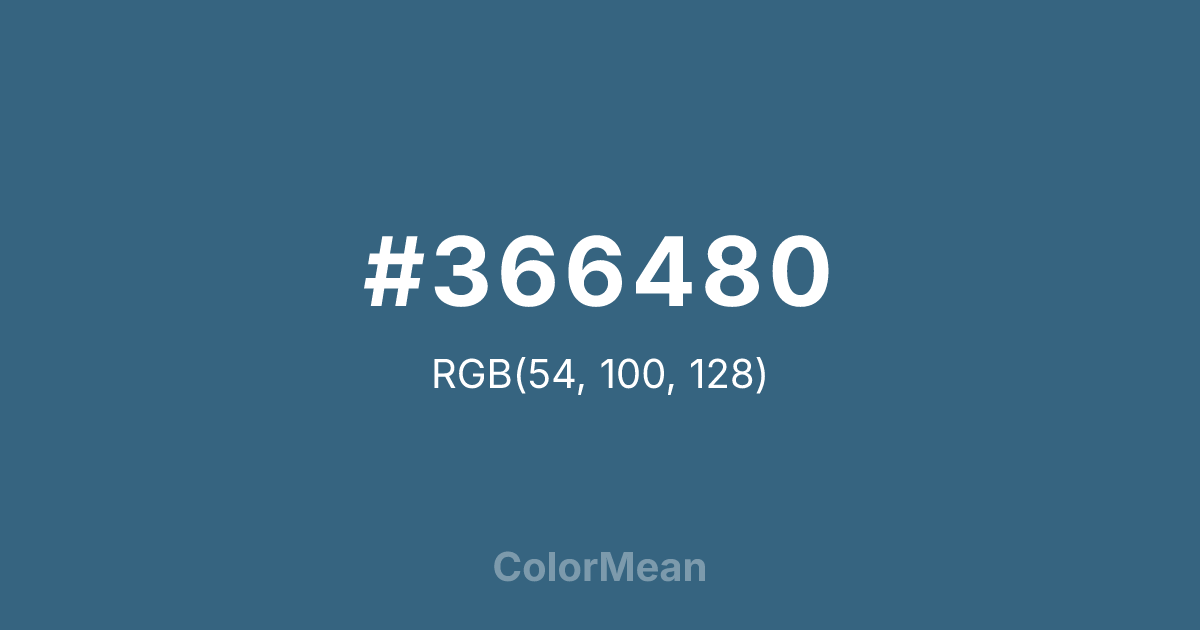 #366480 RGB value is (54, 100, 128). The hex color red value is 54, green is 100, and blue is 128. Its HSL format shows a hue of 203°, saturation of 41 percent, and lightness of 36 percent. The CMYK process values are 58 percent, 22 percent, 0 percent, 50 percent.