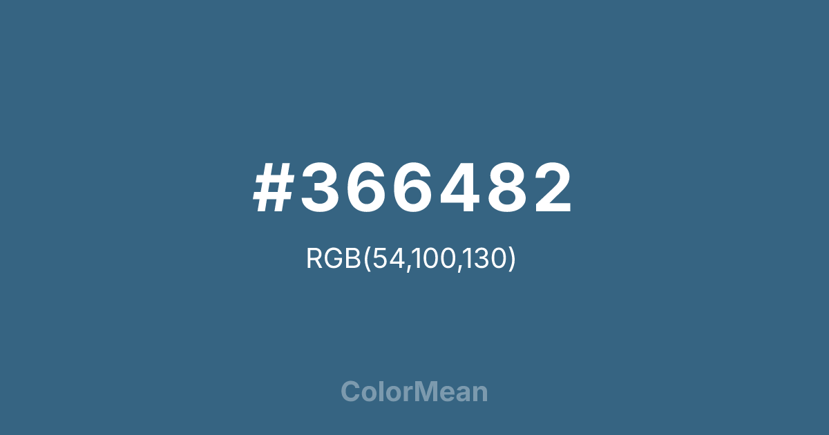 #366482 RGB value is (54, 100, 130). The hex color red value is 54, green is 100, and blue is 130. Its HSL format shows a hue of 204°, saturation of 41 percent, and lightness of 36 percent. The CMYK process values are 58 percent, 23 percent, 0 percent, 49 percent.