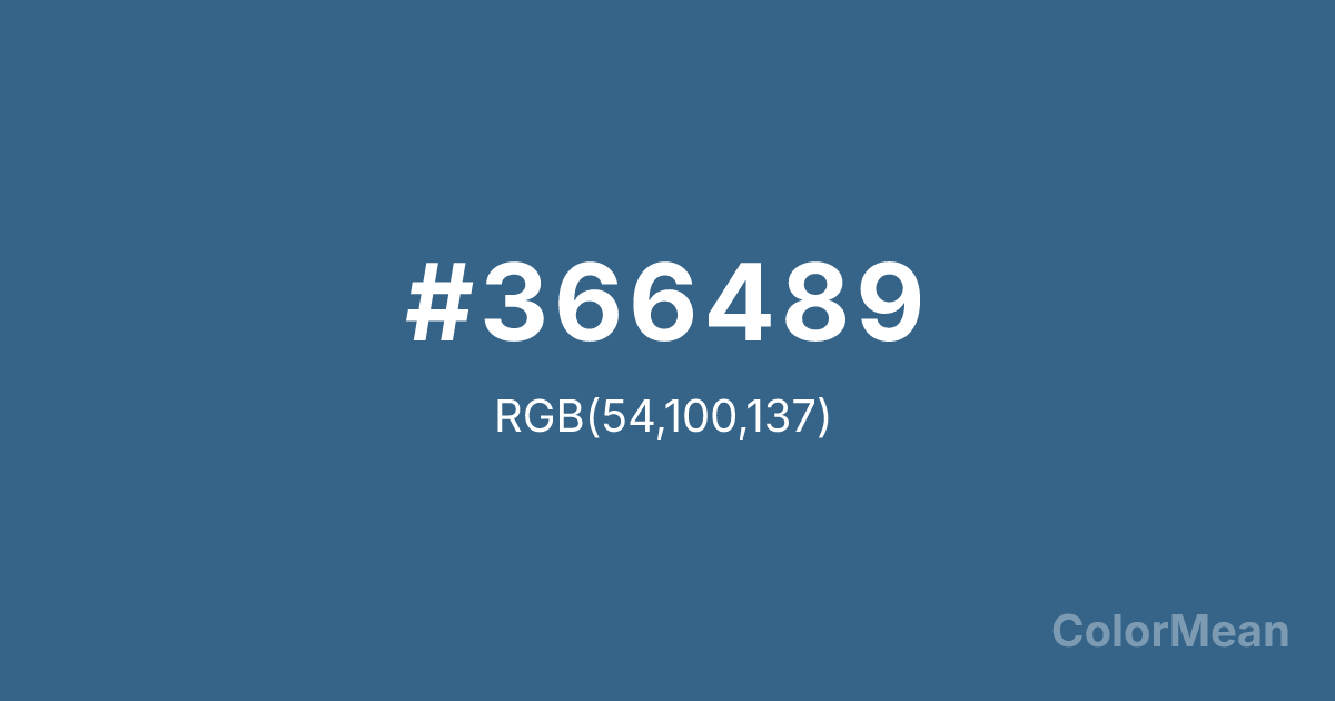 #366489 RGB value is (54, 100, 137). The hex color red value is 54, green is 100, and blue is 137. Its HSL format shows a hue of 207°, saturation of 43 percent, and lightness of 37 percent. The CMYK process values are 61 percent, 27 percent, 0 percent, 46 percent.