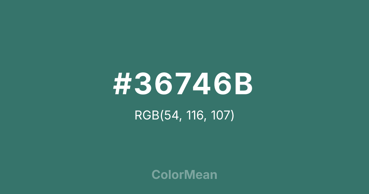#36746B RGB value is (54, 116, 107). The hex color red value is 54, green is 116, and blue is 107. Its HSL format shows a hue of 171°, saturation of 36 percent, and lightness of 33 percent. The CMYK process values are 53 percent, 0 percent, 8 percent, 55 percent.