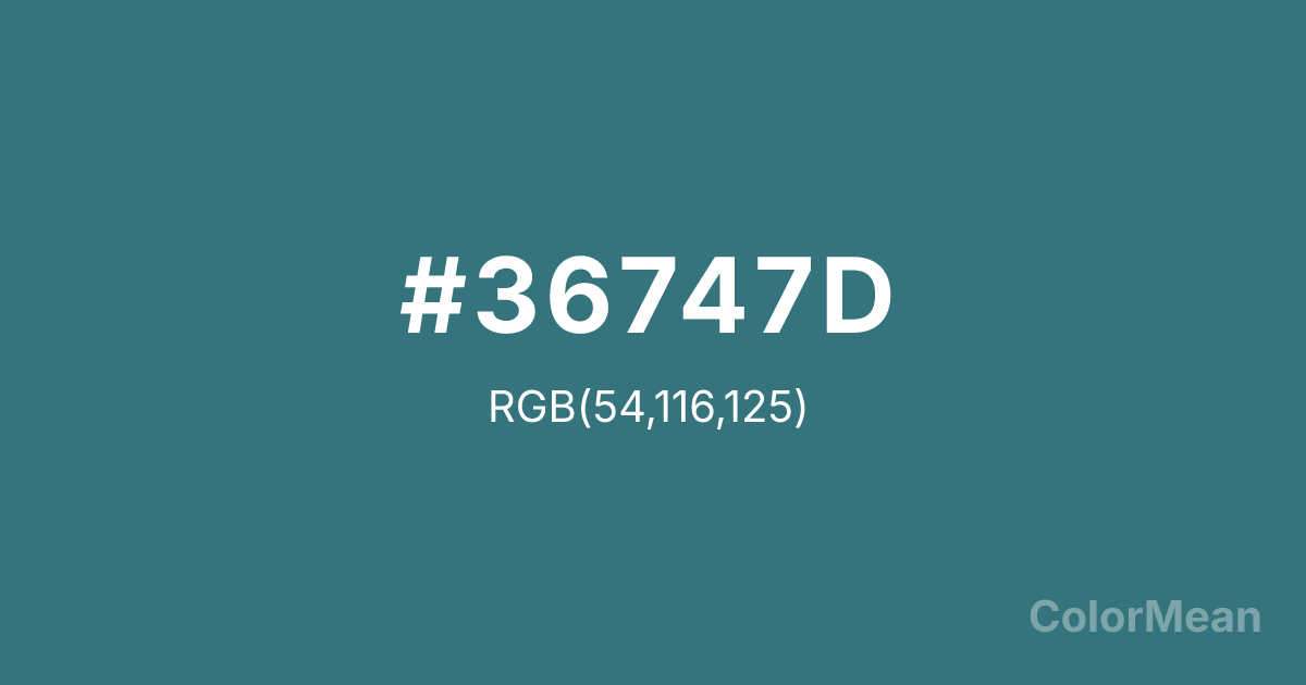 Ming (#36747D) RGB value is (54, 116, 125). The hex color red value is 54, green is 116, and blue is 125. Its HSL format shows a hue of 188°, saturation of 40 percent, and lightness of 35 percent. The CMYK process values are 57 percent, 7 percent, 0 percent, 51 percent.