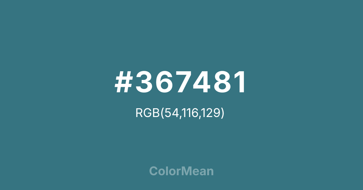 #367481 RGB value is (54, 116, 129). The hex color red value is 54, green is 116, and blue is 129. Its HSL format shows a hue of 190°, saturation of 41 percent, and lightness of 36 percent. The CMYK process values are 58 percent, 10 percent, 0 percent, 49 percent.