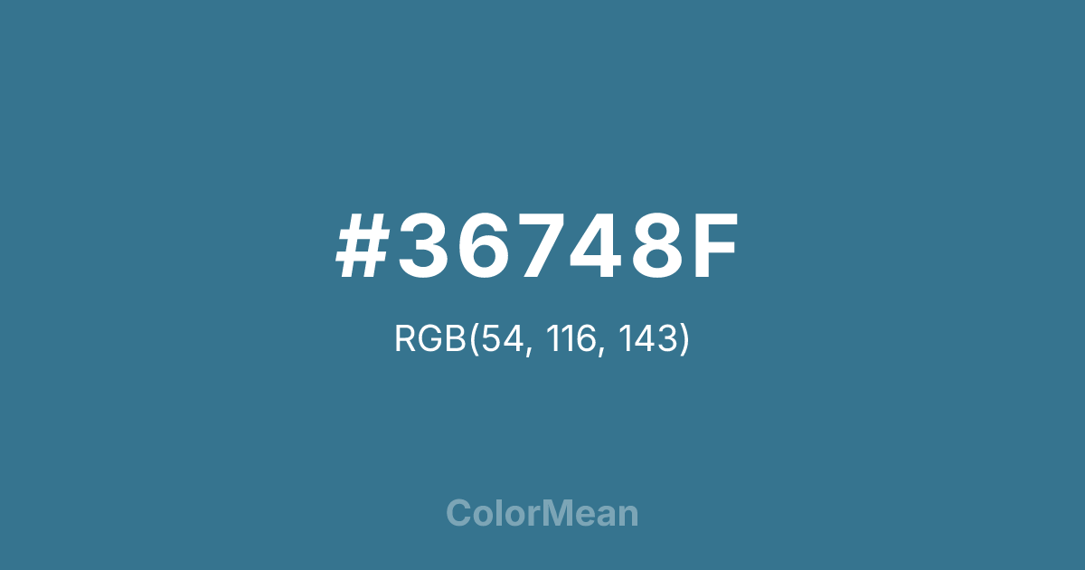 #36748F RGB value is (54, 116, 143). The hex color red value is 54, green is 116, and blue is 143. Its HSL format shows a hue of 198°, saturation of 45 percent, and lightness of 39 percent. The CMYK process values are 62 percent, 19 percent, 0 percent, 44 percent.