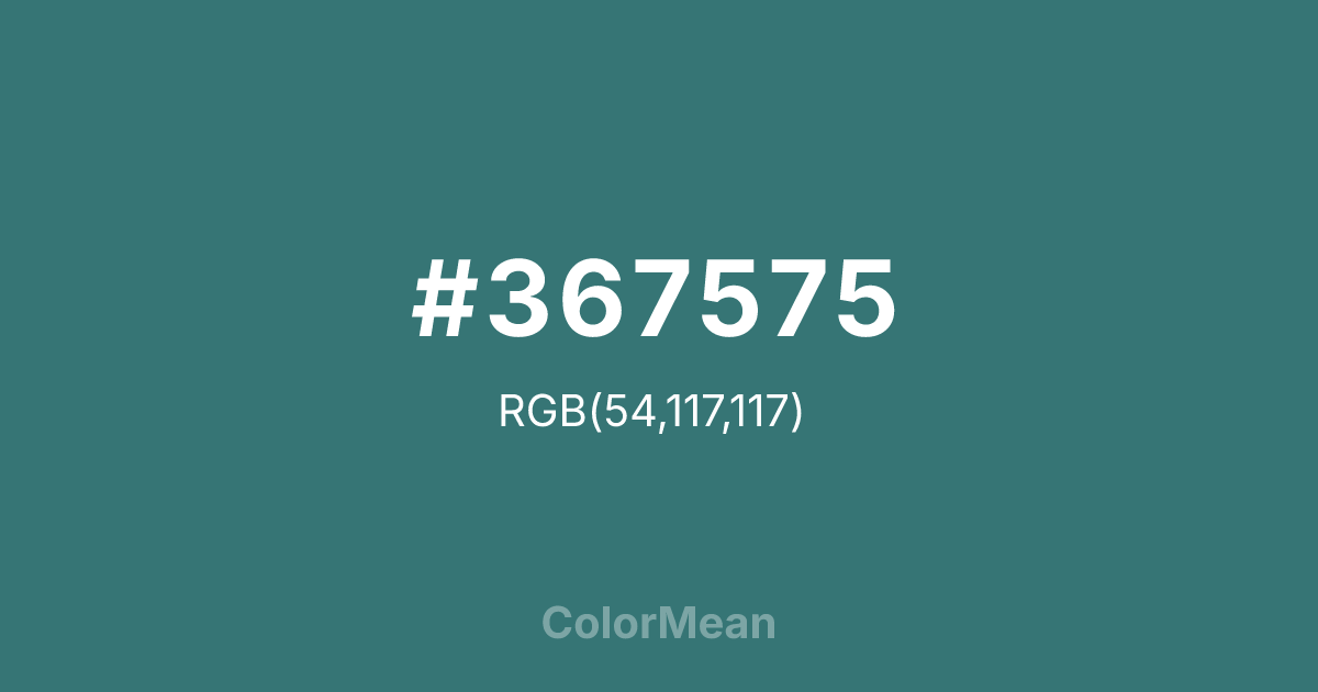 #367575 RGB value is (54, 117, 117). The hex color red value is 54, green is 117, and blue is 117. Its HSL format shows a hue of 180°, saturation of 37 percent, and lightness of 34 percent. The CMYK process values are 54 percent, 0 percent, 0 percent, 54 percent.