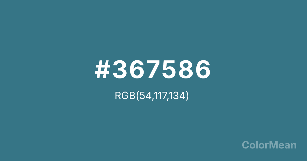 #367586 RGB value is (54, 117, 134). The hex color red value is 54, green is 117, and blue is 134. Its HSL format shows a hue of 193°, saturation of 43 percent, and lightness of 37 percent. The CMYK process values are 60 percent, 13 percent, 0 percent, 47 percent.