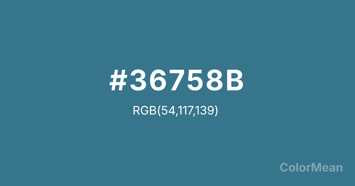 #36758B RGB value is (54, 117, 139). The hex color red value is 54, green is 117, and blue is 139. Its HSL format shows a hue of 196°, saturation of 44 percent, and lightness of 38 percent. The CMYK process values are 61 percent, 16 percent, 0 percent, 45 percent.