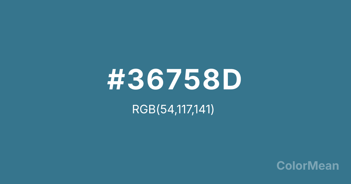 #36758D RGB value is (54, 117, 141). The hex color red value is 54, green is 117, and blue is 141. Its HSL format shows a hue of 197°, saturation of 45 percent, and lightness of 38 percent. The CMYK process values are 62 percent, 17 percent, 0 percent, 45 percent.