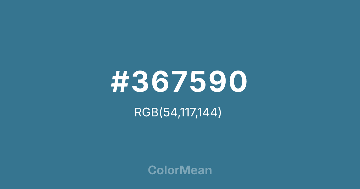 #367590 RGB value is (54, 117, 144). The hex color red value is 54, green is 117, and blue is 144. Its HSL format shows a hue of 198°, saturation of 45 percent, and lightness of 39 percent. The CMYK process values are 63 percent, 19 percent, 0 percent, 44 percent.
