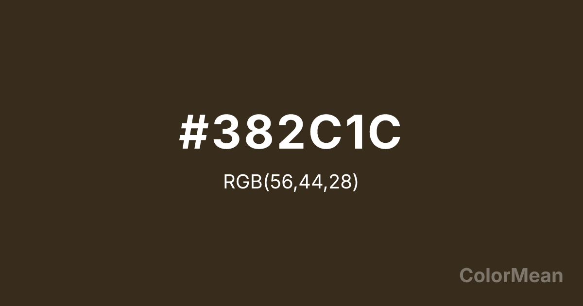 #382C1C RGB value is (56, 44, 28). The hex color red value is 56, green is 44, and blue is 28. Its HSL format shows a hue of 34°, saturation of 33 percent, and lightness of 16 percent. The CMYK process values are 0 percent, 21 percent, 50 percent, 78 percent.