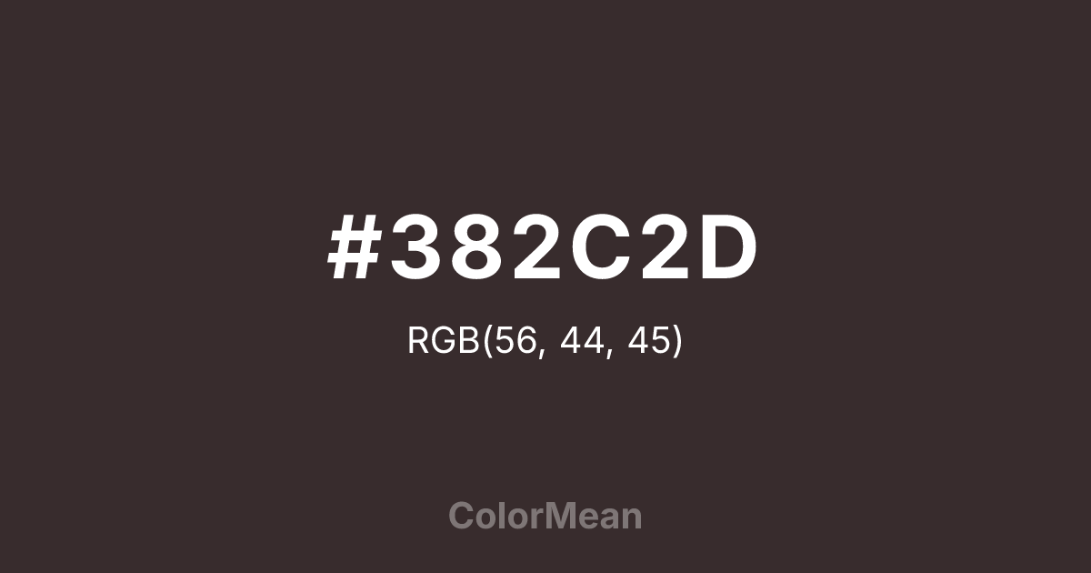 #382C2D RGB value is (56, 44, 45). The hex color red value is 56, green is 44, and blue is 45. Its HSL format shows a hue of 355°, saturation of 12 percent, and lightness of 20 percent. The CMYK process values are 0 percent, 21 percent, 20 percent, 78 percent.