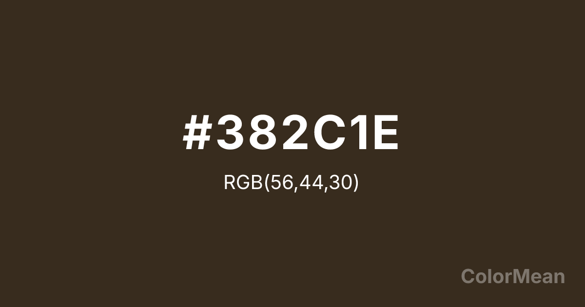 Sepia Brown (#382C1E) RGB value is (56, 44, 30). The hex color red value is 56, green is 44, and blue is 30. Its HSL format shows a hue of 32°, saturation of 30 percent, and lightness of 17 percent. The CMYK process values are 0 percent, 21 percent, 46 percent, 78 percent.