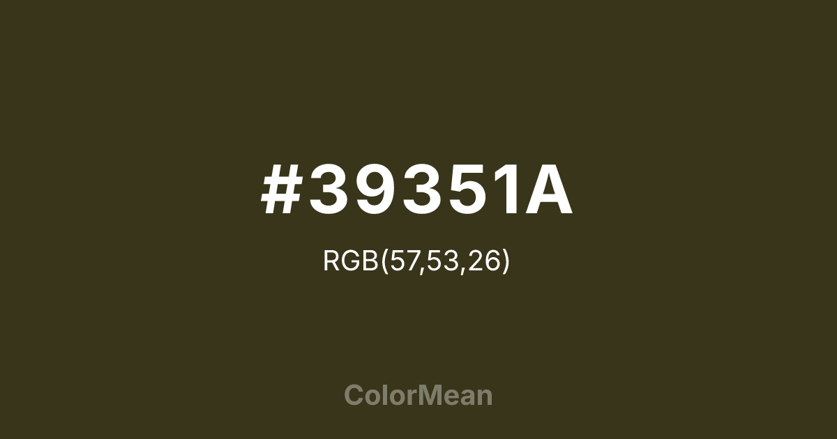 #39351A RGB value is (57, 53, 26). The hex color red value is 57, green is 53, and blue is 26. Its HSL format shows a hue of 52°, saturation of 37 percent, and lightness of 16 percent. The CMYK process values are 0 percent, 7 percent, 54 percent, 78 percent.