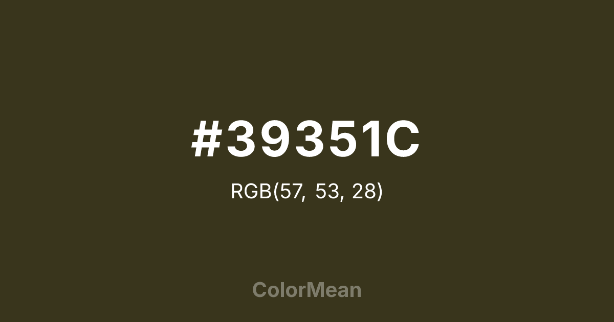 #39351C RGB value is (57, 53, 28). The hex color red value is 57, green is 53, and blue is 28. Its HSL format shows a hue of 52°, saturation of 34 percent, and lightness of 17 percent. The CMYK process values are 0 percent, 7 percent, 51 percent, 78 percent.
