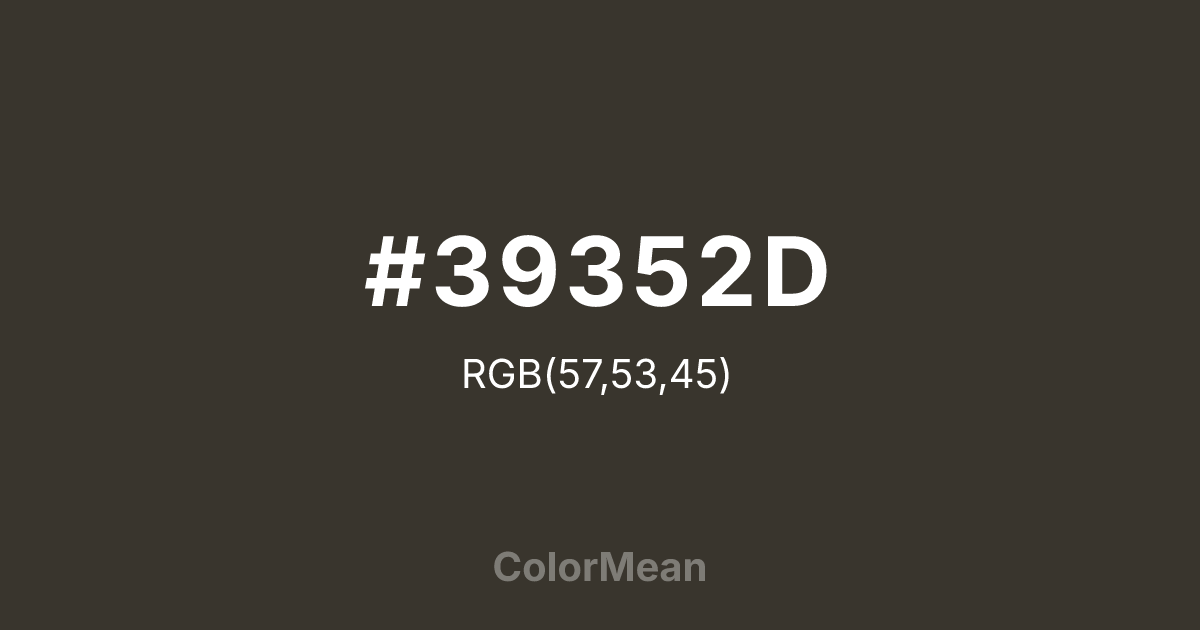 #39352D RGB value is (57, 53, 45). The hex color red value is 57, green is 53, and blue is 45. Its HSL format shows a hue of 40°, saturation of 12 percent, and lightness of 20 percent. The CMYK process values are 0 percent, 7 percent, 21 percent, 78 percent.
