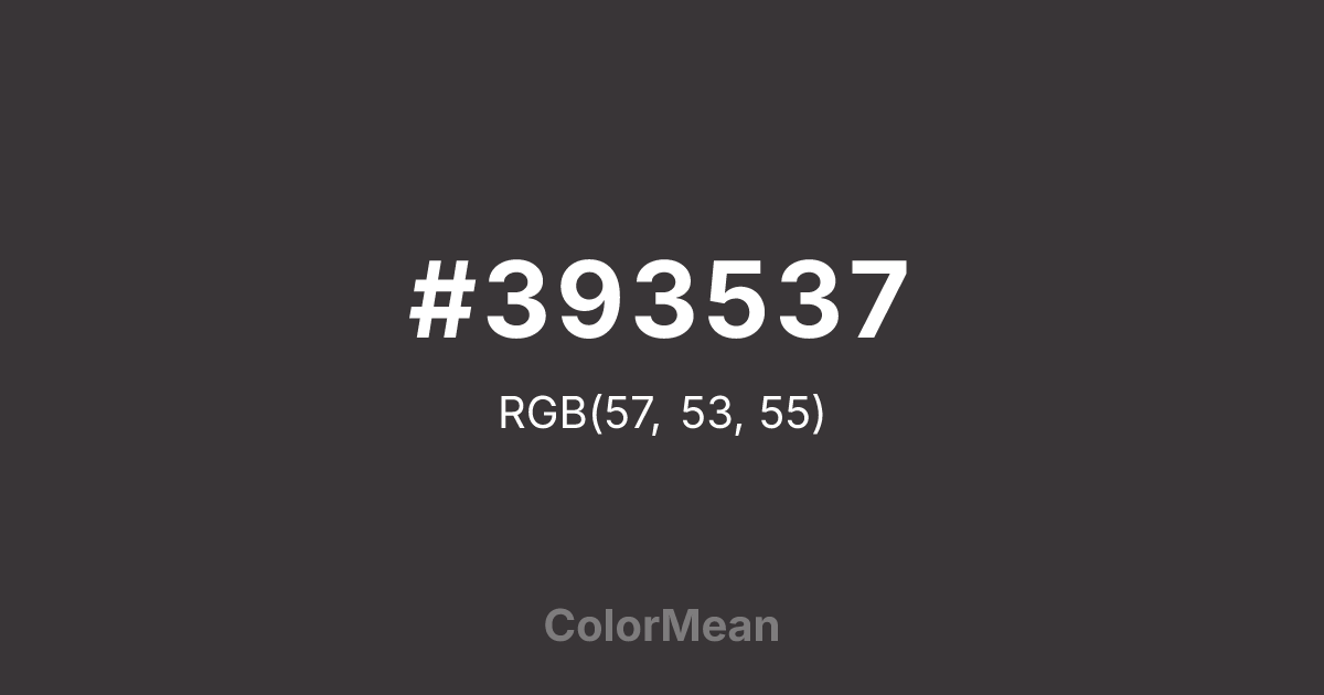 #393537 RGB value is (57, 53, 55). The hex color red value is 57, green is 53, and blue is 55. Its HSL format shows a hue of 330°, saturation of 4 percent, and lightness of 22 percent. The CMYK process values are 0 percent, 7 percent, 4 percent, 78 percent.