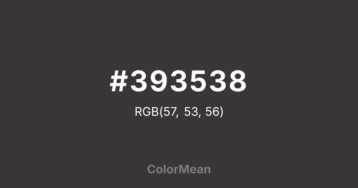 #393538 RGB value is (57, 53, 56). The hex color red value is 57, green is 53, and blue is 56. Its HSL format shows a hue of 315°, saturation of 4 percent, and lightness of 22 percent. The CMYK process values are 0 percent, 7 percent, 2 percent, 78 percent.