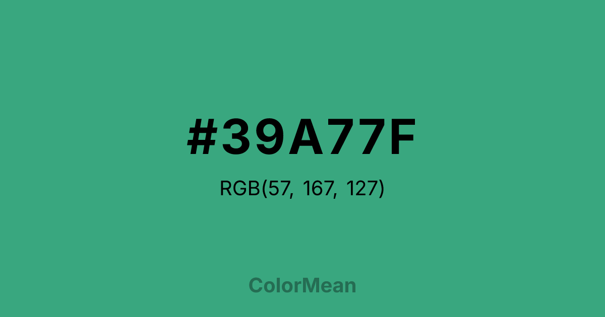 #39A77F RGB value is (57, 167, 127). The hex color red value is 57, green is 167, and blue is 127. Its HSL format shows a hue of 158°, saturation of 49 percent, and lightness of 44 percent. The CMYK process values are 66 percent, 0 percent, 24 percent, 35 percent.