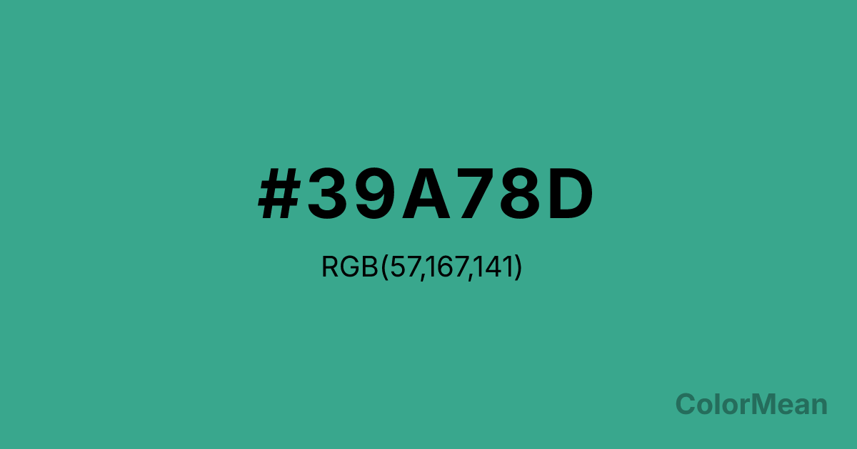 #39A78D RGB value is (57, 167, 141). The hex color red value is 57, green is 167, and blue is 141. Its HSL format shows a hue of 166°, saturation of 49 percent, and lightness of 44 percent. The CMYK process values are 66 percent, 0 percent, 16 percent, 35 percent.