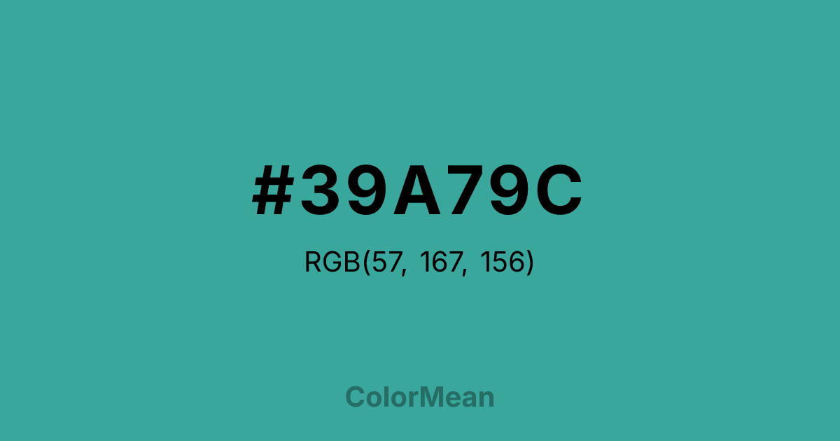 #39A79C RGB value is (57, 167, 156). The hex color red value is 57, green is 167, and blue is 156. Its HSL format shows a hue of 174°, saturation of 49 percent, and lightness of 44 percent. The CMYK process values are 66 percent, 0 percent, 7 percent, 35 percent.