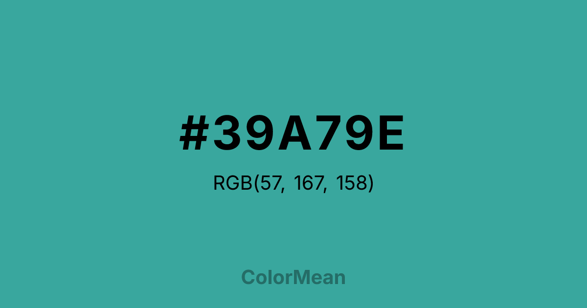 #39A79E RGB value is (57, 167, 158). The hex color red value is 57, green is 167, and blue is 158. Its HSL format shows a hue of 175°, saturation of 49 percent, and lightness of 44 percent. The CMYK process values are 66 percent, 0 percent, 5 percent, 35 percent.