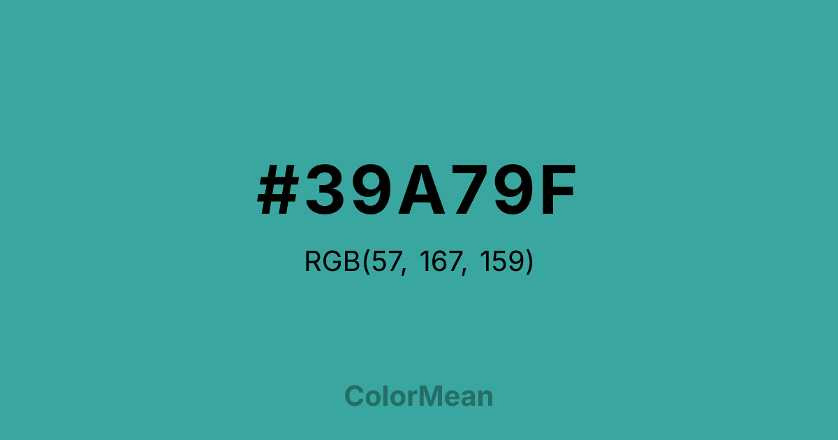 #39A79F RGB value is (57, 167, 159). The hex color red value is 57, green is 167, and blue is 159. Its HSL format shows a hue of 176°, saturation of 49 percent, and lightness of 44 percent. The CMYK process values are 66 percent, 0 percent, 5 percent, 35 percent.