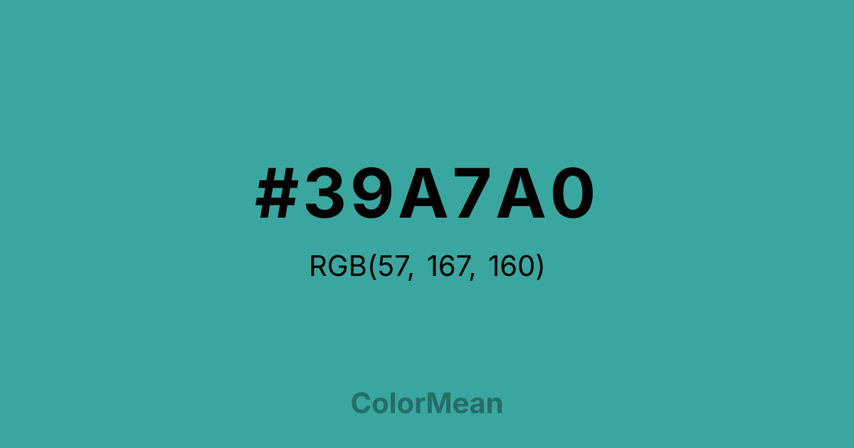 #39A7A0 RGB value is (57, 167, 160). The hex color red value is 57, green is 167, and blue is 160. Its HSL format shows a hue of 176°, saturation of 49 percent, and lightness of 44 percent. The CMYK process values are 66 percent, 0 percent, 4 percent, 35 percent.
