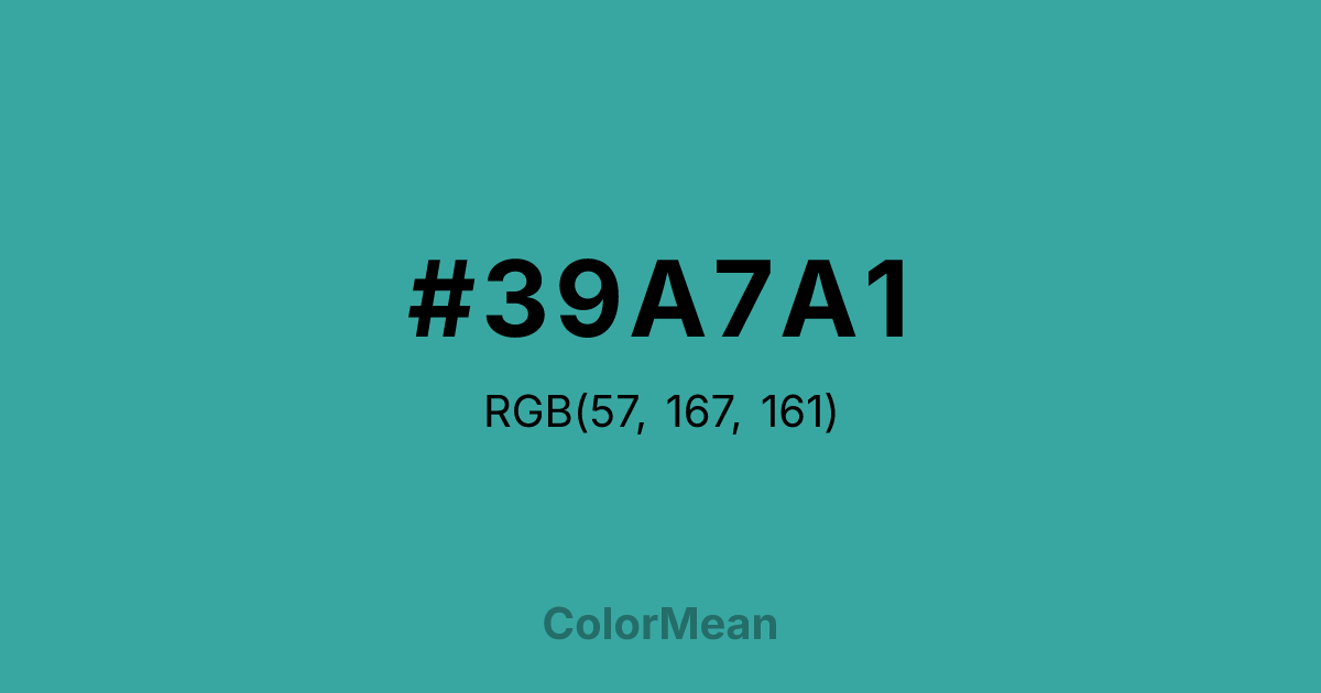 #39A7A1 RGB value is (57, 167, 161). The hex color red value is 57, green is 167, and blue is 161. Its HSL format shows a hue of 177°, saturation of 49 percent, and lightness of 44 percent. The CMYK process values are 66 percent, 0 percent, 4 percent, 35 percent.