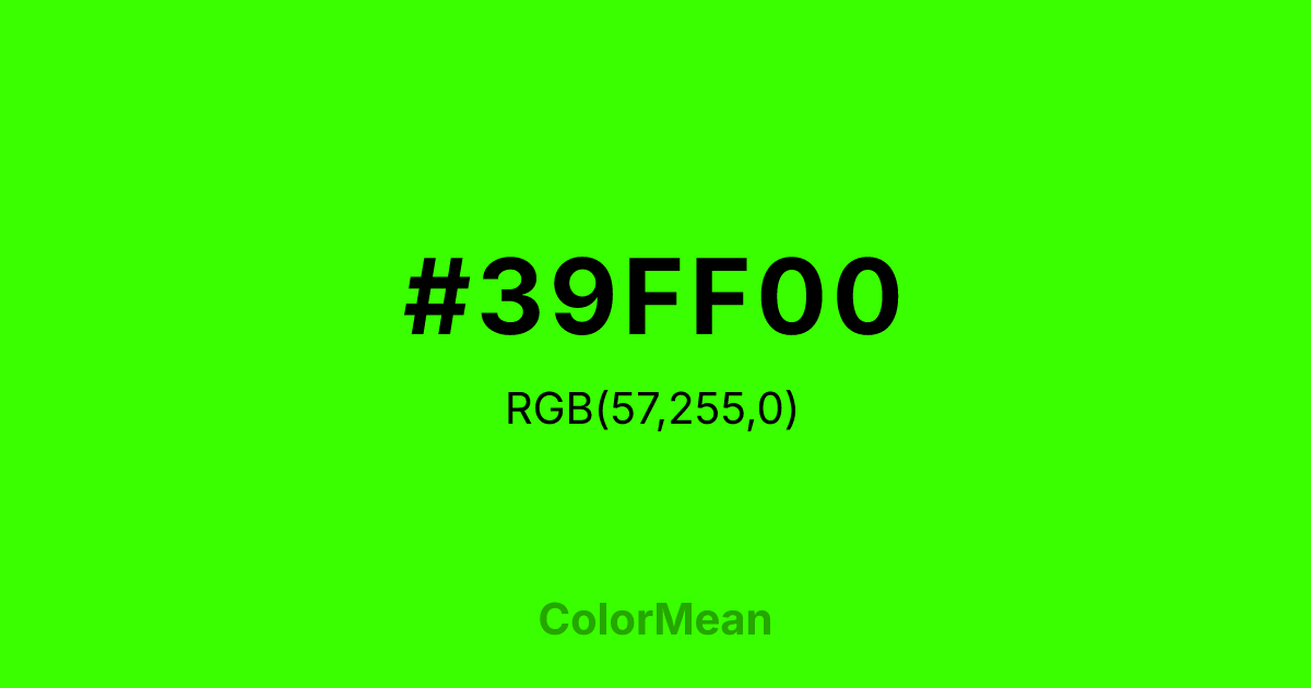 #39FF00 RGB value is (57, 255, 0). The hex color red value is 57, green is 255, and blue is 0. Its HSL format shows a hue of 107°, saturation of 100 percent, and lightness of 50 percent. The CMYK process values are 78 percent, 0 percent, 100 percent, 0 percent.