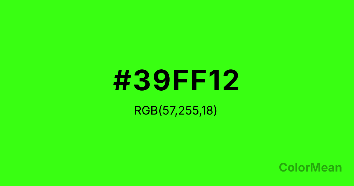 #39FF12 RGB value is (57, 255, 18). The hex color red value is 57, green is 255, and blue is 18. Its HSL format shows a hue of 110°, saturation of 100 percent, and lightness of 54 percent. The CMYK process values are 78 percent, 0 percent, 93 percent, 0 percent.