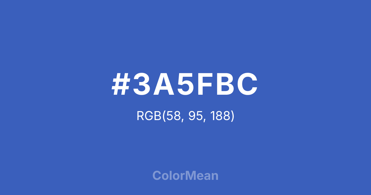 #3A5FBC RGB value is (58, 95, 188). The hex color red value is 58, green is 95, and blue is 188. Its HSL format shows a hue of 223°, saturation of 53 percent, and lightness of 48 percent. The CMYK process values are 69 percent, 49 percent, 0 percent, 26 percent.