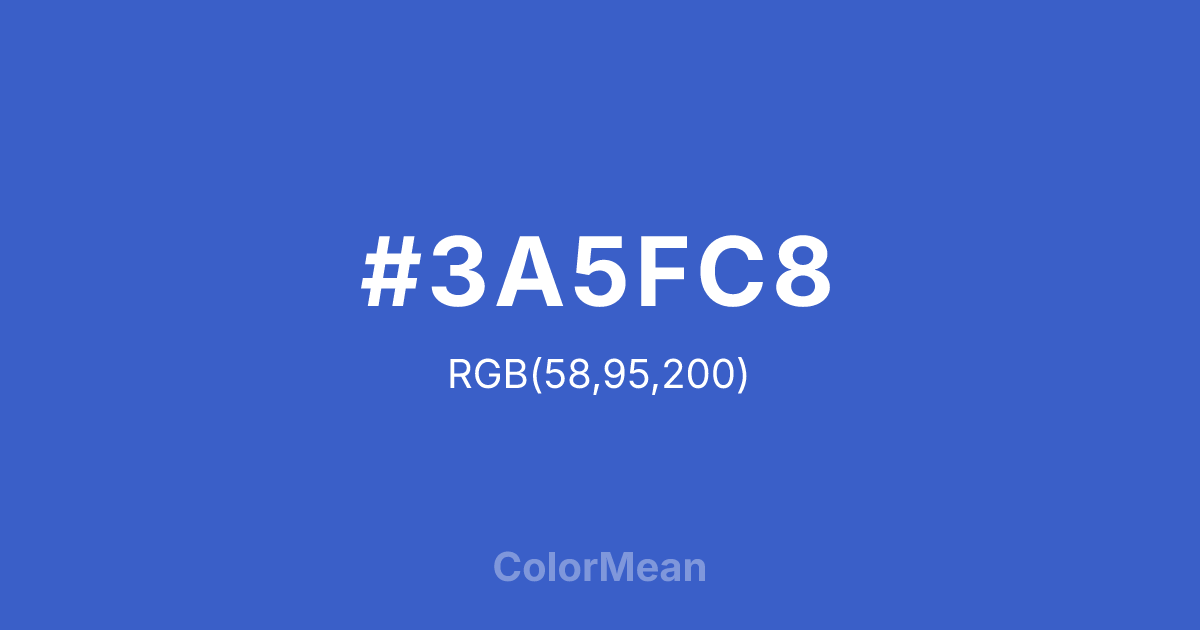 #3A5FC8 RGB value is (58, 95, 200). The hex color red value is 58, green is 95, and blue is 200. Its HSL format shows a hue of 224°, saturation of 56 percent, and lightness of 51 percent. The CMYK process values are 71 percent, 53 percent, 0 percent, 22 percent.